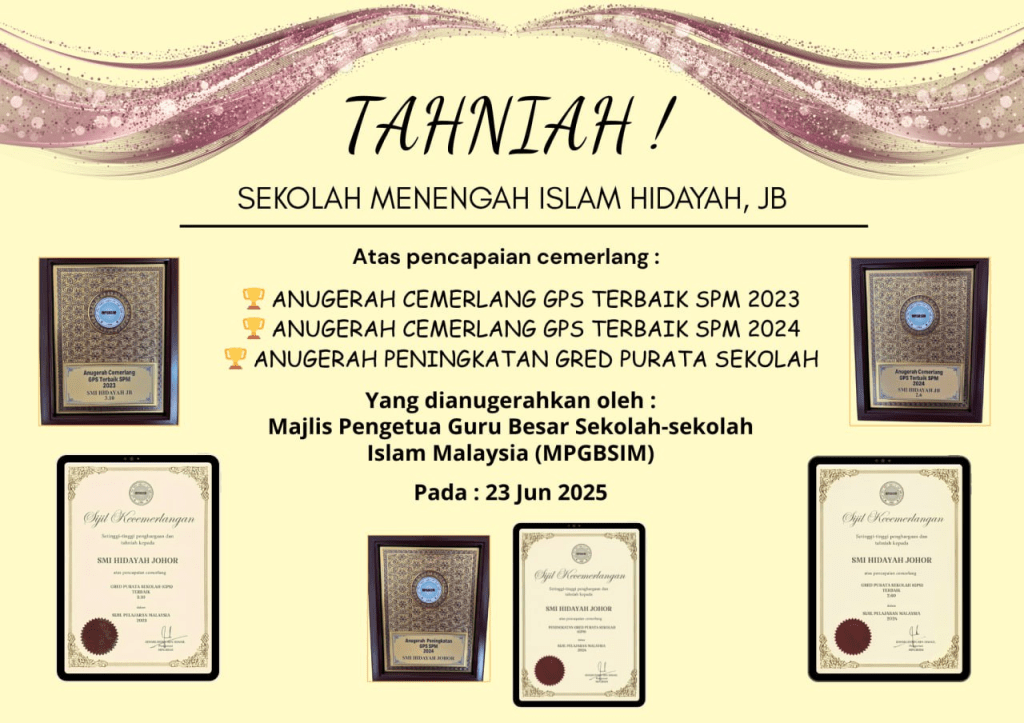 Sekolah Menengah Islam Hidayah merakamkan setinggi-tinggi penghargaan kepada semua guru, pelajar, ibu bapa, serta pihak pengurusan atas sokongan yang tidak berbelah bahagi dalam menjayakan misi kecemerlangan ini.