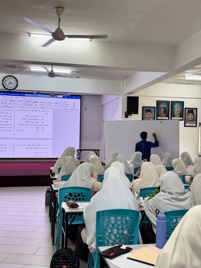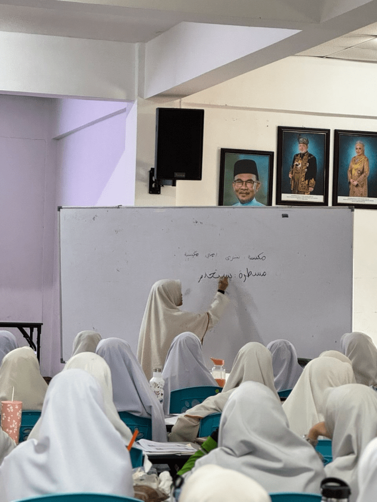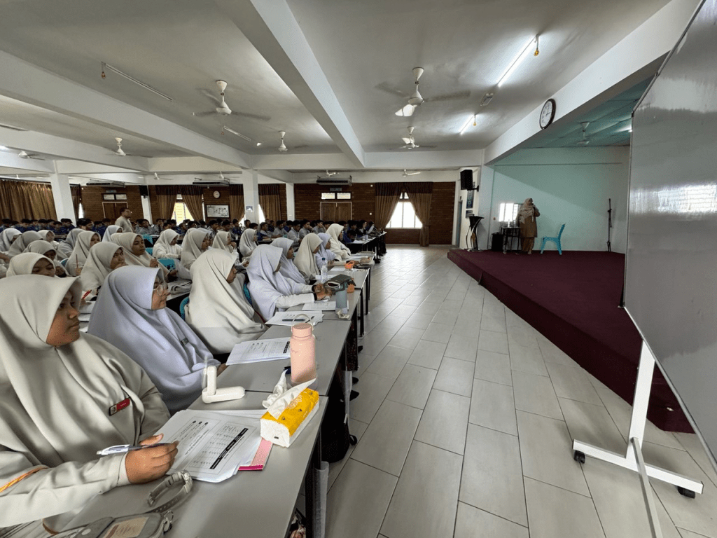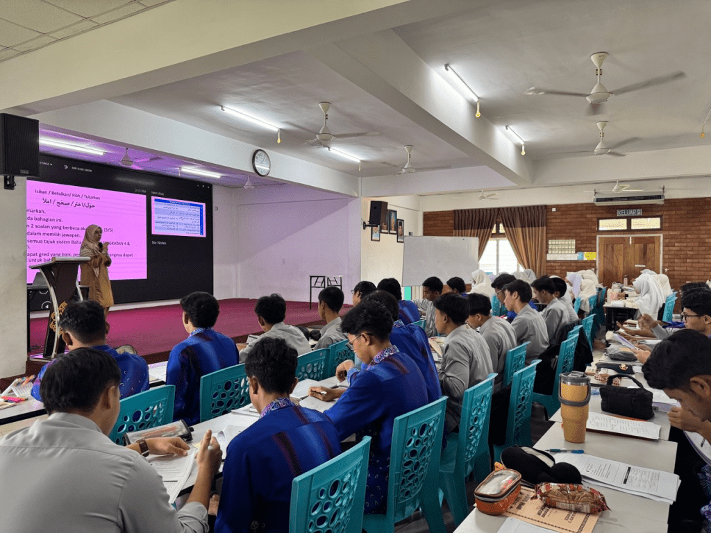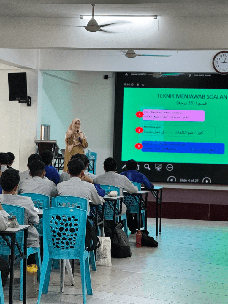 Sepanjang bengkel, penceramah memberikan penjelasan terperinci tentang teknik menjawab sambil meminta beberapa pelajar menjawab soalan secara langsung bagi menguji kefahaman mereka. Penerangan yang jelas serta contoh soalan yang dikongsikan membantu pelajar memahami cara menjawab dengan lebih berkesan.