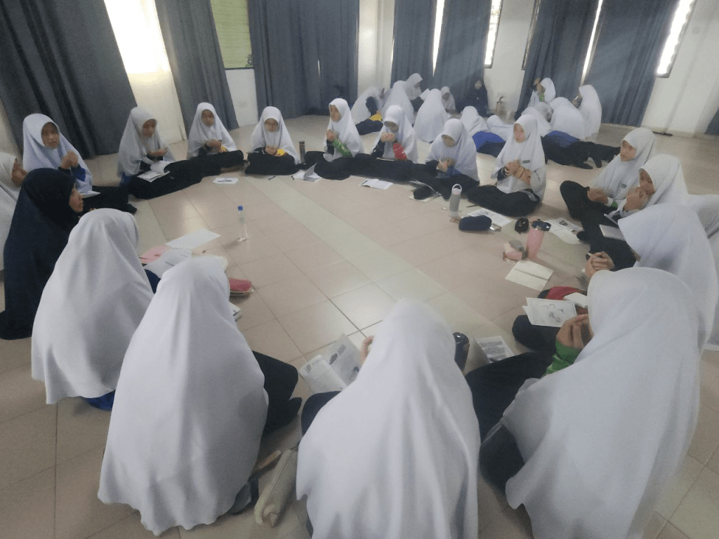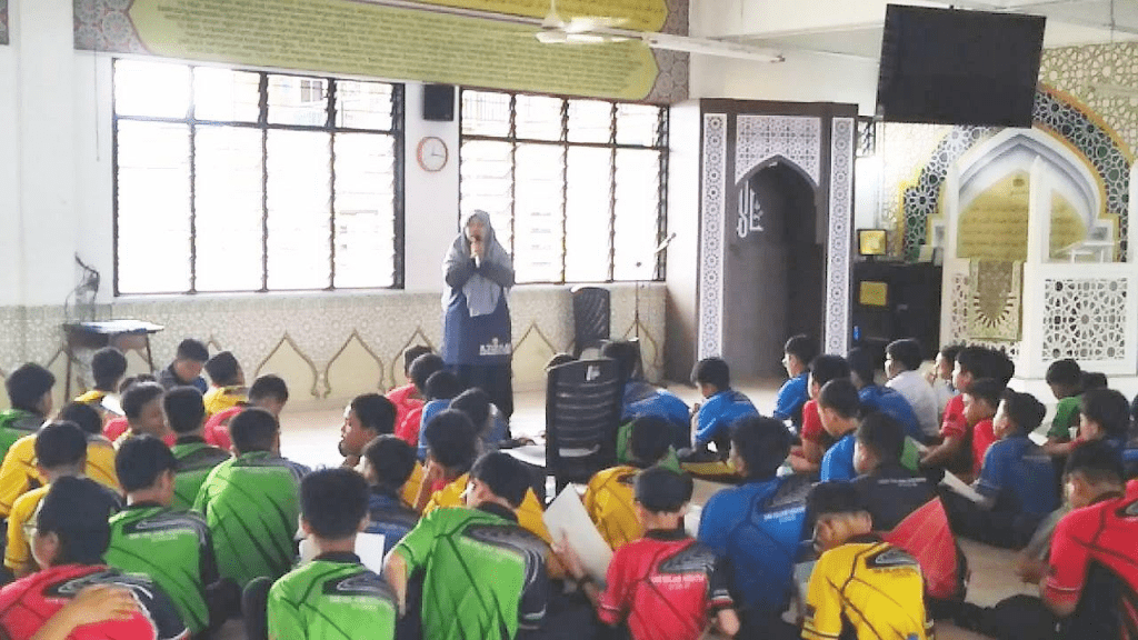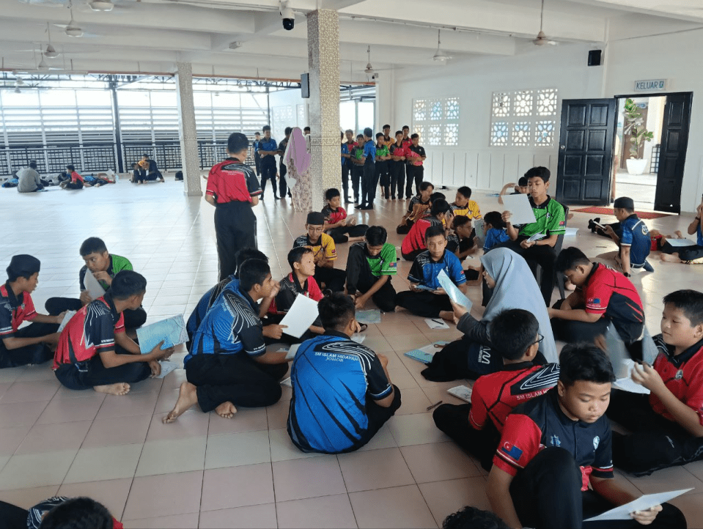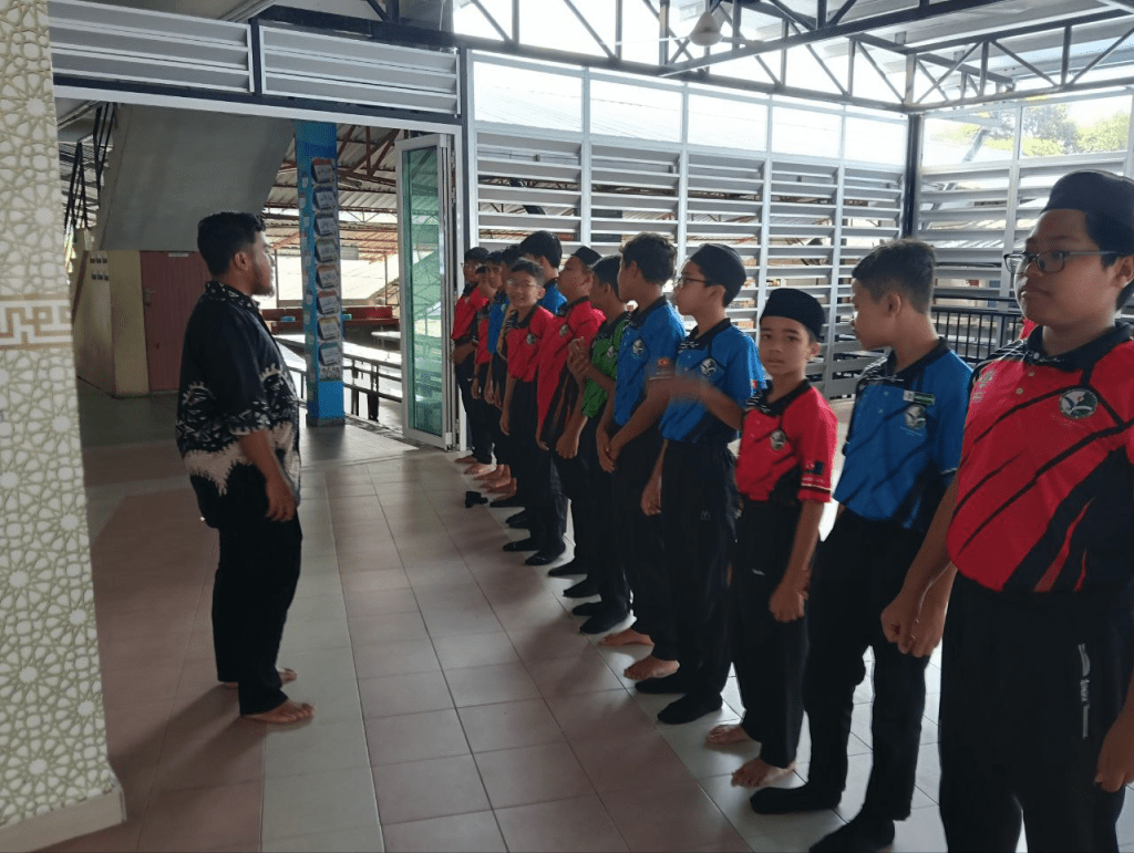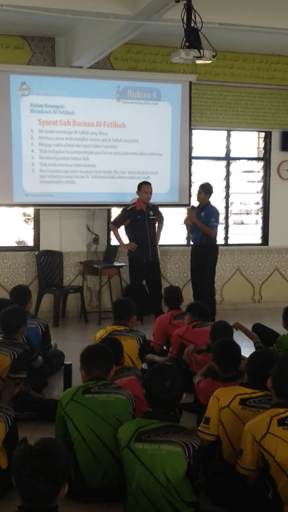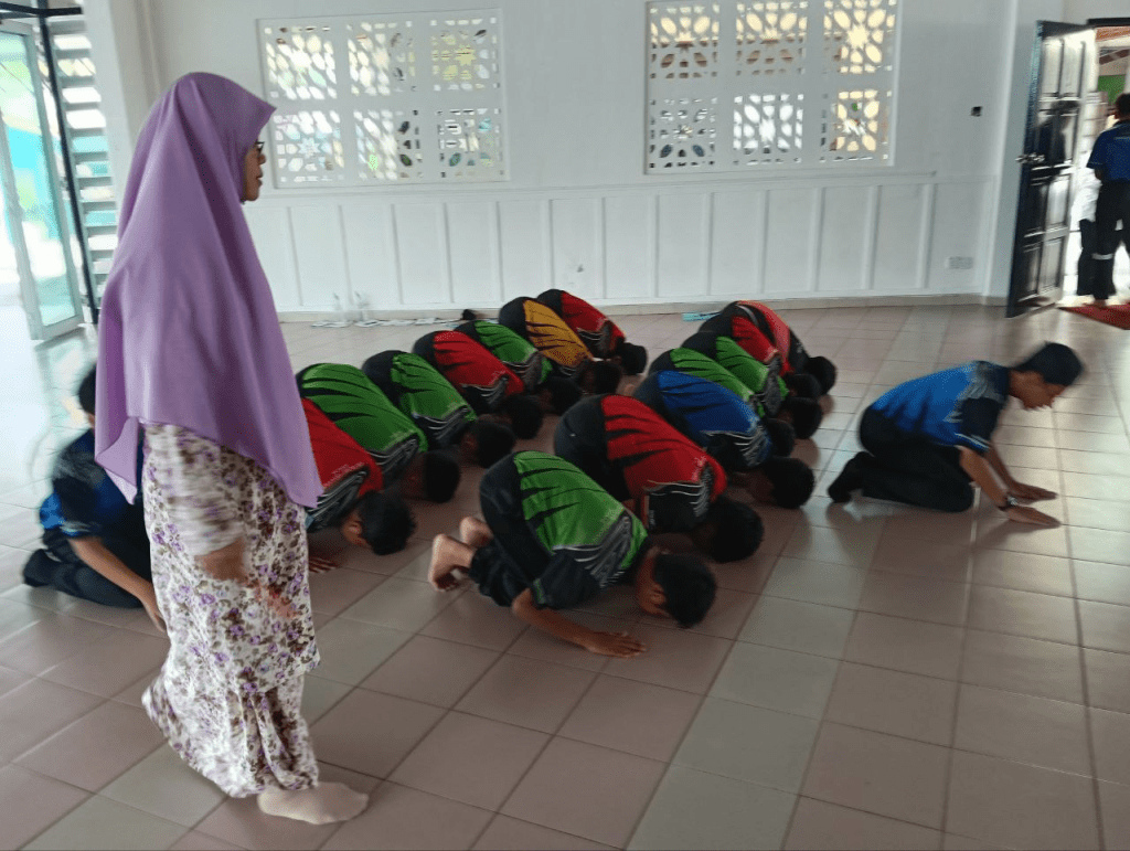 latihan solat dalam kumpulan lengkap dengan bacaan, pergerakan dan adab kemudian diakhiri dengan refleksi penghayatan ibadah.