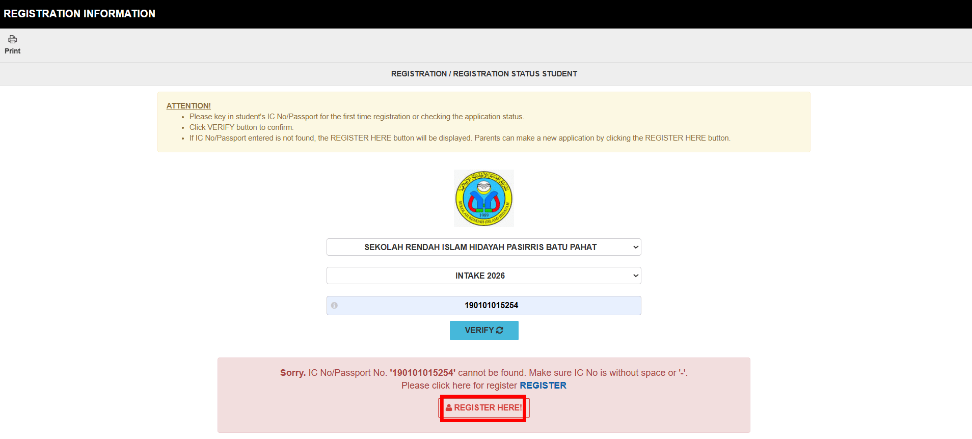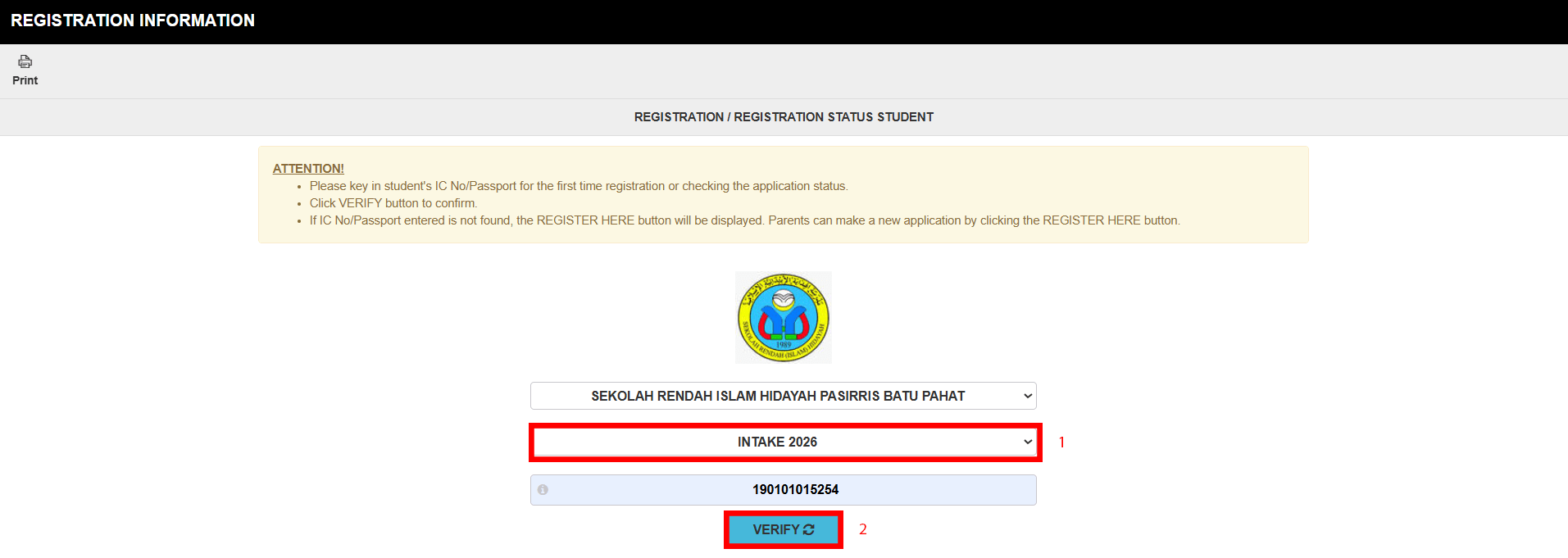 Isi nombor IC anak anda di ruang ( 1 ), kemudian Klik ‘Verify’ pada ( 2 ) seperti tertera pada gambar di bawah: